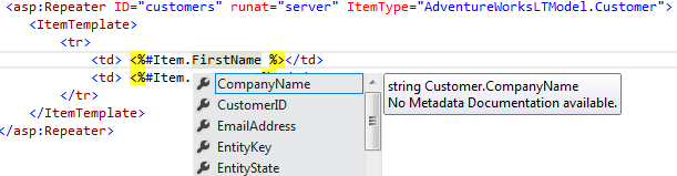 I am going to write a series of post on the same feature here also. Till date, you all must have had a look on the enhancement and new features introduced in ASP.NET 4.5. The main change in data control that now it provides intellisense support at aspx pages. You need to assign the ItemType property to model that is going to be associated with the data controls. As