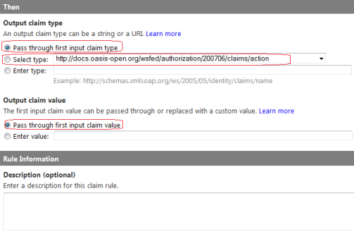 Here either we can pass through as it is or we can send it in some another type that is available in second encircled drop-down. It has a list of standard claims that we can choose off. Also we can put our own custom claim type in the text box. Every claim type is in URI format as per standard so custom type also should follow the standard. I have selected pass through. The last section is Rule Information . here we can put the details about the rules.