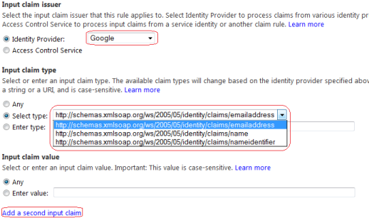 It has three section, first section If first option Identity provider, once we select it accordingly it populates all the claims provided. As I selected Google and enlist all the claims by provided by Google in dropdown as marked in second encircled area. We can add here another input claim as last encircled link. Now let’s move to next section that is Then