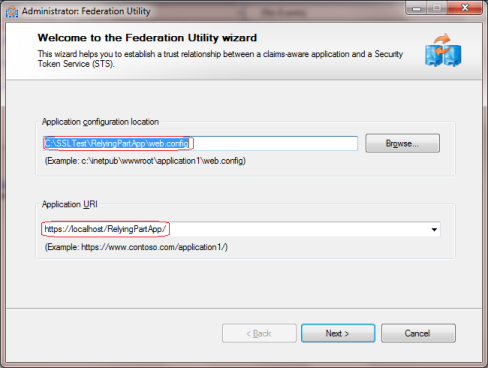 First encircled area contains Relying party configuration settings and another is Application URI. Click on next