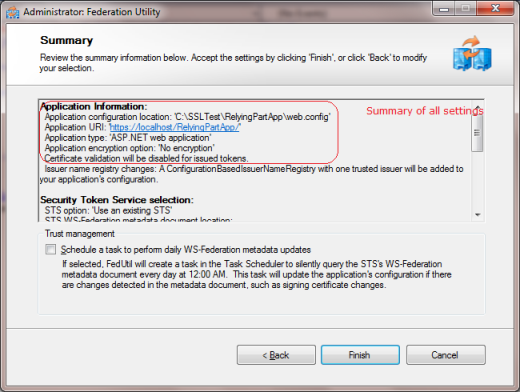 Now click finish. And we have built a trust relationship between federated provider and our own Application (Relying Party).