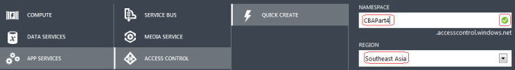 Select App Service ->Access Control -> Quick Create. It asks for namespace and region. The namespace should be globally unique, else it will not be accepted. After filling it click on Create
