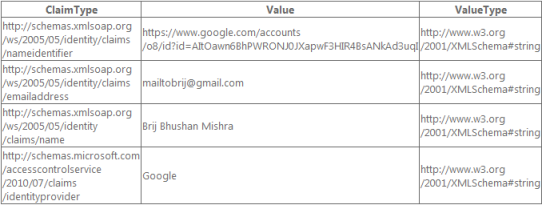 I have displayed three values here ClaimType, Value and ValueType. Here Google returned four Claims which has it’s descriptions and my mail-id and name. Similarly if I login through another Identity Providers, they will show different claims. We can use these values in our relying party for different purposes.