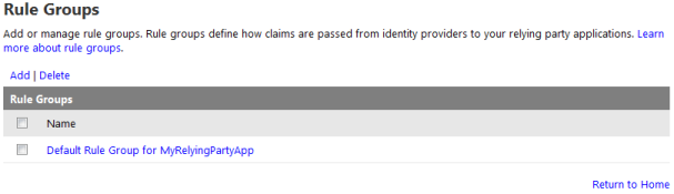 It adds by default a rule group for added Relying party. We can create new one . We need to add the rules in the rule group assigned to Relying party. For that click on Default rule group on the above screen shot and it redirects us to