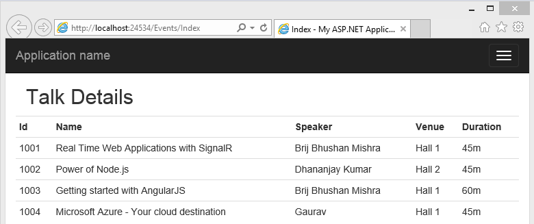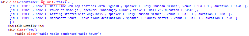 So here, put a div over the table and in div element, we initialized the variable talks using ng-init directive as above. So using this directive, we can provide some initial value to a variable.