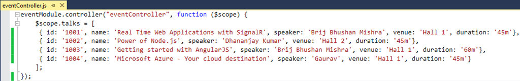 So here controller also got registered with Module. In this method we initialized the talks in $scope variable which is a default parameter to the controller.