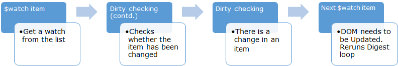 Earlier in this post, I mentioned that whenever an event occurs on browser, digest loop gets fired. It contains two smaller loops, one processes $evalAsync queue and other iterates the watch list for each item, to detect the changes. Then, it finds all the items which got changed and UI gets updated accordingly.