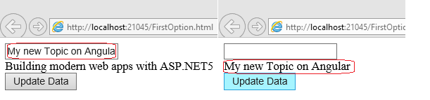 In the template above, I added an input text box and provided the model (ng-model) name as myTalkName .Another important point (ng-click) to see here, how the value is passed. Here we need to provide an object map so that it gets bound correctly as {updatedName : mytalkName}. Now, Lets see it running